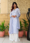 A long chikankari shirt featuring a round neckline adorned with intricate beadwork and handmade 3D tassels. The slit sleeves are detailed with delicate applique work, while the shirt hem is finished with elegant applique and handmade tassels for a refined touch. Paired with a raw silk lacha and a machine-embroidered organza dupatta, this ensemble exudes timeless grace, blending traditional craftsmanship with modern sophistication.