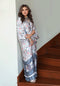 Crafted from luxuriously soft printed silk, this caftan features a delicate all-over floral print in soothing pastel tones, radiating timeless charm. Its full-length, free-flowing silhouette drapes effortlessly over the body, complemented by wide bell sleeves with slits and intricate bead detailing. A long beaded tassel at the neckline adds a touch of handcrafted elegance. Paired with matching printed silk straight trousers, the ensemble strikes a perfect balance between comfort and sophistication.