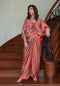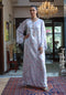 Drape yourself in elegance with this exquisite printed silk kaftan gown. The fluid silhouette is shaped by a ruched front drawstring, creating graceful gathers and a flattering fit. An asymmetrical drape evokes a sari-inspired fall, while dolman sleeves add to the flowing charm. Finished with a handcrafted, long beaded tassel at the front and paired with matching printed silk straight trousers, this ensemble completes a look that is both elevated and effortlessly graceful.
