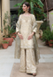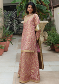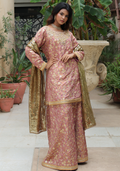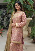 This elegant tea pink Jamawar short shirt features hand and machine embroidery on the round neckline, enhanced with lace and gota detailing for a touch of tradition. Paired with matching tea pink embroidered Jamawar ajar pants and a gold sequin dupatta finished with gota edging, this outfit perfectly blends sophistication and festive charm. Ideal for weddings, festive occasions, and formal gatherings, it reflects true Pakistani craftsmanship and luxury fashion