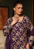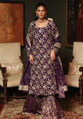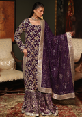 This stunning purple chiffon long shirt features intricate machine-to-hand embroidery on a classic round neckline for a refined, elegant look. It is paired with a jamawar farshi gharara. The ensemble is completed with an embroidered chiffon dupatta, beautifully finished with gota detailing on all four sides. Perfect for weddings, festive occasions, and formal gatherings, this outfit embodies traditional craftsmanship and timeless elegance.