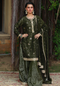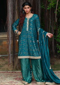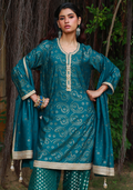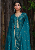 Sea green kamdani knee-length shirt with a round neckline, detailed with gota and button accents. The shirt and full sleeves feature gota borders for an elegant finish. Paired with jamawar wide-leg pants adorned with a gota border, and a kamdani dupatta embellished with gota lace and tassels on all four sides.