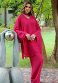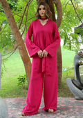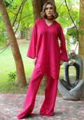 This fuchsia pink outfit features a short straight shirt with slit open sleeves and a V-neckline with band collar, styled with straight pants for a modern, minimal look. Perfect for casual gatherings, it brings effortless grace and comfort.