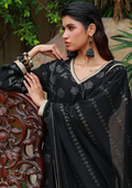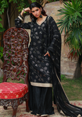 Black kamdani long shirt with a V-neckline adorned with gota lace, featuring additional gota detailing on the borders and sleeves, accented with a tassel on the side. Paired with a silk crushed gharara finished with a gota border, and a kamdani dupatta edged with gota on all four sides and tassels along the corners.