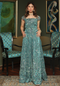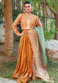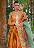 Mustard chiffon embroidered open-front blouse featuring a band collar with intricate hand and machine work. The blouse is adorned with gota detailing along the borders and fitted sleeves embellished with hand and machine embroidery on borders. Paired with a silk crushed skirt finished with a gota border, and a jamawar shawl adorned with embroidered lace on all four sides and tassels along the edges for a timeless festive look.