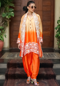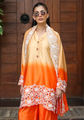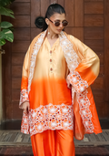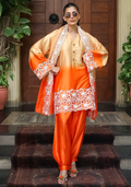 This two-tone orange Tie & Dye outfit features light and dark orange hues artistically blended to create a vibrant statement. Kimono collar, The shirt and dupatta are adorned with white cutwork embroidery, adding depth and delicacy. The embroidered hem and sleeves enhance its festive allure, while the silk dupatta and plated shalwar complete the look with refined sophistication. A perfect pick for Eid, brunches, or intimate gatherings.
