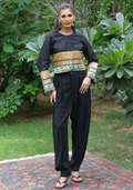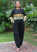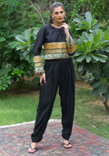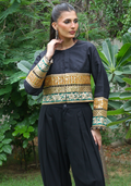 This elegant outfit features a black Jamawar waist-length jacket with lace embroidered detailing along the sleeves and hem, styled over black pleated straight pants. The round neckline adds a refined touch, making it ideal for festive occasions or formal gatherings.