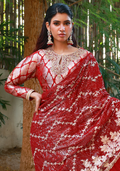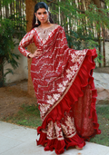 Maroon gota work chiffon saree featuring silk pleated ruffles along the border for a striking finish. Paired with a jamawar blouse showcasing a keyhole neckline with intricate hand and machine embroidery, gota on the blouse border and sleeves, and a matching short silk patti coat for a regal, layered look.