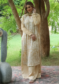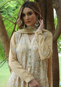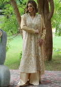This elegant beige outfit features a kimono neckline long shirt adorned with paisley embroidery and hand-to-machine embellishment throughout with button detail. The design is completed with pearl-detailed lace finishing, satin silk wide-leg pants, and a chiffon embroidered dupatta that adds a soft, graceful touch. Perfect for formal occasions, festive wear, and wedding events, this ensemble combines traditional craftsmanship with modern sophistication.