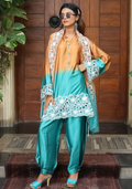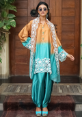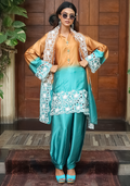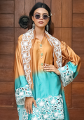 Crafted in Pakistan, this elegant Tie & Dye outfit blends sea green and orange tones with intricate white cutwork embroidery all over the shirt and dupatta. Kimono collar The silk dupatta, finished with fine detailing, flows gracefully alongside embroidered sleeves and hemline. Paired with a plated shalwar, this outfit is a perfect blend of color, craft, and comfort ideal for summer festivities and daytime celebrations.