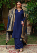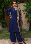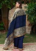 Navy Blue raw silk long shirt with a keyhole neckline, adorned with gota lace detailing on the neckline and sleeve borders. Paired with plazo pants featuring a gota lace border and a jamawar shawl dupatta finished with embroidered lace on all four sides and tassels along the edges.