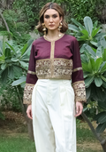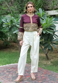 This elegant outfit features a maroon Jamawar waist-length jacket with lace embroidered detailing along the sleeves and hem, styled over white pleated straight pants. The round neckline adds a refined touch, making it ideal for festive occasions or formal gatherings.