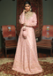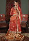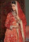 Deep rust silk embroidered long shirt featuring intricate handwork on the neckline, sleeves, and shirt borders, styled with a round neckline for a classic touch. Paired with a gold silk farshi gharara finished with a gota border, and a machine-embroidered dupatta adorned with gota lace on all four sides for a regal, traditional look.
