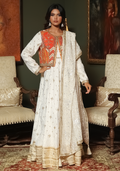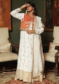 This elegant white outfit features a crushed embroidered gown with a round neckline, gota lace detailing, and a bordered hem for a refined look. It is paired with an orange silk embroidered vest accented with gota work, and a chiffon embroidered dupatta finished with gota and tassels. Perfect for weddings, festive celebrations, and formal events, this ensemble combines traditional craftsmanship with modern sophistication.