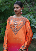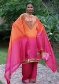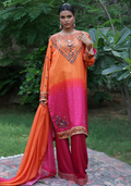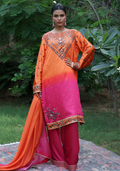 Radiate festive charm in this orange and pink tie-dye silk ensemble, featuring a round neckline and exquisite hand embroidery with gota detailing all over. The vibrant tie-dye silk shirt captures the spirit of celebration with its playful hues, while the straight pants with gota finishing and a matching dupatta complete the look in effortless harmony. A perfect choice for wedding festivities, Eid celebrations, and summer soirées, this outfit blends traditional craftsmanship with modern elegance.