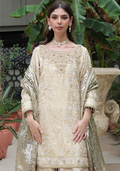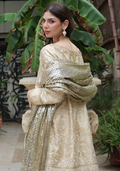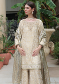 This graceful dull gold Jamawar short shirt features hand and machine embroidery on the round neckline, adorned with lace and gota detailing for an elegant festive look. Paired with machine-embroidered Jamawar ajar pants and a dull gold sequin dupatta finished with gota edging, this ensemble beautifully combines traditional charm and luxury craftsmanship. Perfect for weddings, festive events, and formal celebrations.